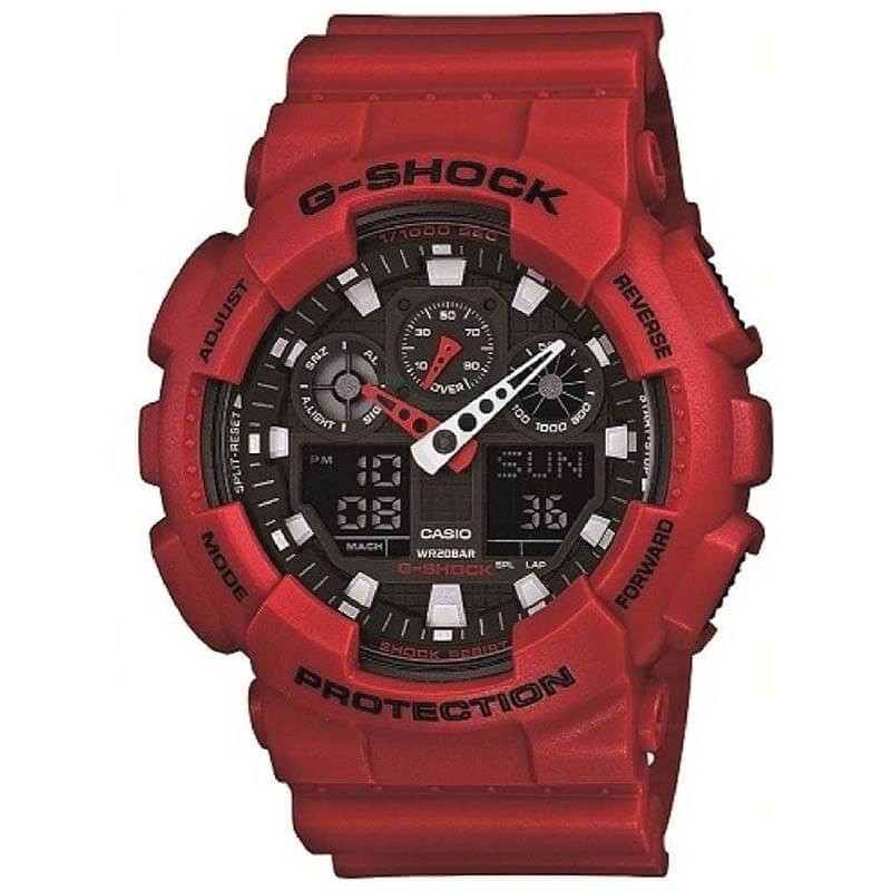 Muški g shock casio multifunkcionalni crveni sportski analogno digitalni ručni satŠifra proizvoda GA-100B-4AER Brend G Shock Pol Muški Kolekcija Sportski Kolekcija Brenda Classic Garancija 2 godine Materijal kaiša Silikonski kais Boja kaiša Crvena Širina kaiša 29 mm Tip kopče kaiša Kopča sa iglicom Zamenljivost kaiša Nestandardni Ulaz Materijal kućišta Smola Oblik brojčanika Okrugao Dimenzija brojčanika 51 mm Debljina kućišta 17 mm Vodootpornost sata 20 ATM Staklo Mineralno Mehanizam N/A Kalibar mehanizma N/A Izloženi mehanizam Ne Ušrafljujuća krunica Ne Rotirajuća korona Ne Prikaz vremena Analogno/Digitalni Boja brojčanika Crna Štoperica Da Dan Da Datum Da Mesec Da 24 časovni indikator N/A 24 časovno vreme N/A 20 Sekundarna štoperica N/A Vremenske zone Da Indikator dan/noć Ne Luminacija Da Brzinometar Da Osvetljenje Da - Dostava i povraćaj