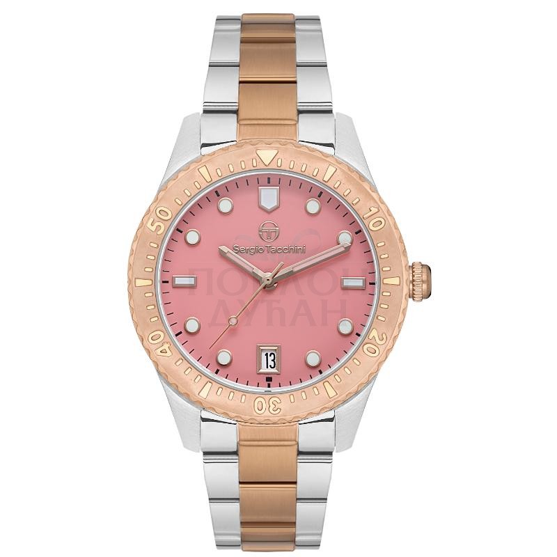 Ženski sergio tacchini coastlife rozi roze zlatni sportsko elegantni ruČni sat sa bikolor metalnim kaiŠemŠifra proizvoda ST.1.10408.5 Brend Sergio Tacchini Pol Ženski Kolekcija Sportski, Elegantni Kolekcija Brenda Coastlife Garancija 2 godine Materijal kaiša Metalni kaiš Boja kaiša Bikolor Širina kaiša 18 mm Tip kopče kaiša Preklopna Kopča Sa Sigurnosnom Dugmadi Zamenljivost kaiša Standardni Ulaz Materijal kućišta Čelik Oblik brojčanika Okrugao Dimenzija brojčanika 38 mm Debljina kućišta N/A Vodootpornost sata 5 ATM Staklo Mineralno Mehanizam N/A Kalibar mehanizma Seiko Izloženi mehanizam Ne Ušrafljujuća krunica Ne Rotirajuća korona Ne Prikaz vremena Analogni Boja brojčanika Roza Štoperica Ne Dan Ne Datum Da Mesec Ne 24 časovni indikator N/A 24 časovno vreme N/A 20 Sekundarna štoperica N/A Vremenske zone Ne Indikator dan/noć Ne Luminacija Fosfor Brzinometar Ne Osvetljenje Ne - Dostava i povraćaj